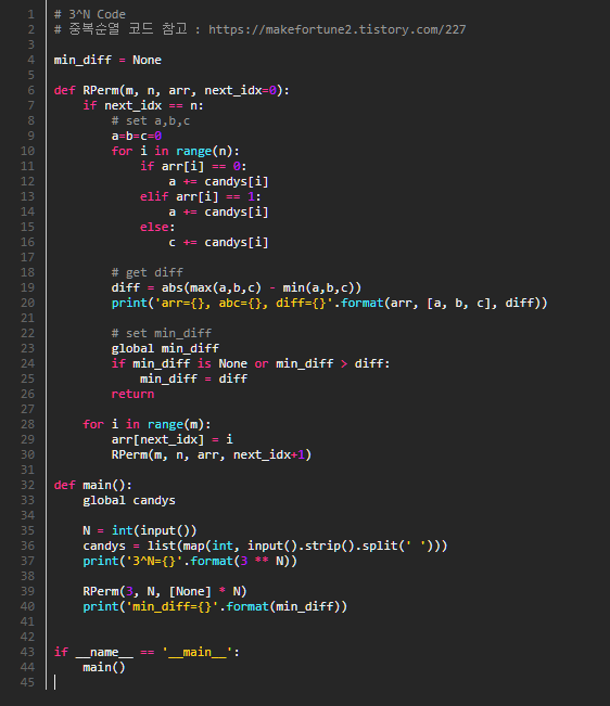 이 문제를 푸는 가장 단순한 방법은 사탕을 나눠 주는 모든 방법을 하나씩 만들어 보는 것입니다. 각 사탕마다 셋 중 어느 어린이에게 줄 지를 결정한다고 하면 3^N, 즉 최대 205조 개의 방법을 만들어 보게 됩니다. 이는 죽기 전에 다 세어볼 수 있을까 엄두가 나지 않는 큰 수이지만, 사실 이 때 우리는 엄청나게 많은 수를 중복으로 세고 있습니다. 실제로 받은 사탕들이 서로 다르더라도 그 무게가 같다면 이 문제의 답은 같다는 점을 무시했기 때문입니다.